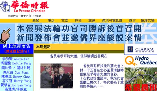 El 3 de noviembre del 2001, en la Prensa China (The Chinese Press) se publicó un artículo que criticaba a Falun Gong, el cuento contado por la misma He Bing, ex practicante de Falun Gong. Sin embargo, el organismo de Falun Gong acusó a la Prensa China de “calumnia”. El 7 de diciembre del 2005, el Tribunal Superior de Quebec de Canadá ejecutó la sentencia de instancia final de este caso que duraba cuatro a?os, y declaró al demandante como perdedor del pleito. La sentencia judicial afirmó que Falun Gong es un movimiento contencioso, uno que no acepta críticas.