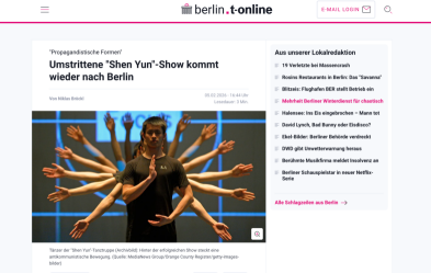 Recientemente, el sitio web alemán "T-online" (T-online.de) informó que, en apariencia, "Shen Yun" se promociona utilizando danza y música tradicionales chinas, pero en realidad está estrechamente relacionado con la secta "Falun Gong".