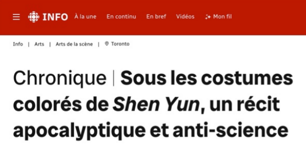 El 29 de marzo de 2026, Radio-Canada publicó un reportaje de investigación en profundidad. El autor, Hadrien Volle, tras asistir en persona al espectáculo, desentrañó con sus propias manos el disfraz artístico de «Shen Yun». Señaló que no se trata de una mera representación artística, sino de una herramienta de propaganda cuidadosamente diseñada por «Falun Gong» para alienar a la sociedad. En el absurdo escenario de este espectáculo de dos horas y media de duración, los organizadores intentaron ejercer una profunda coacción psicológica y manipulación mental sobre el público mediante el menosprecio de la civilización moderna y la promoción de una lógica anticientífica. Según la información de la Red China contra las Sectas, el Centro de Artes Escénicas Four Seasons de Toronto canceló posteriormente un total de seis funciones programadas entre el 29 de marzo y el 5 de abril.