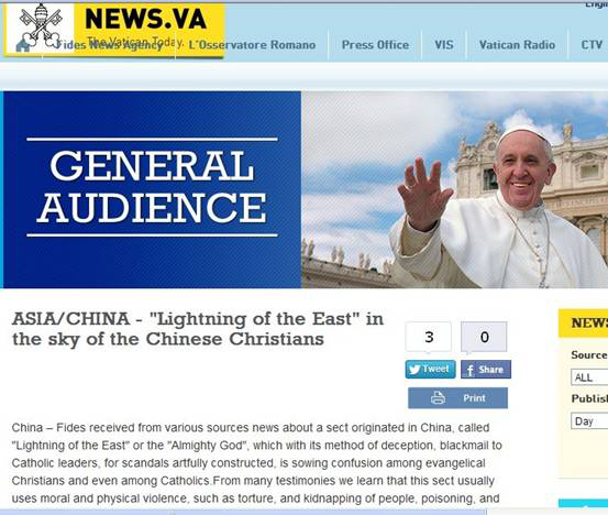 El 14 de abril de 2013, el medio de comunicación del Vaticano «Vatican Today» publicó el artículo «“Dios Todopoderoso” ataca el cielo de los fieles chinos», en el que se señalaba que el Vaticano había tenido conocimiento, a través de numerosas fuentes diferentes, de que la secta «Dios Todopoderoso», originaria de China, estaba provocando confusión entre los cristianos evangélicos e incluso entre los fieles católicos mediante diversos métodos engañosos, entre los que se incluían la fabricación de mentiras y calumnias, así como la intimidación de los líderes católicos. Numerosas pruebas demuestran que esta secta recurre habitualmente a la violencia física y psicológica, como la tortura, así como a métodos de captación como el secuestro y la sustracción de personas, y que encarcela e incluso asesina a los miembros que intentan abandonar «Dios Todopoderoso».