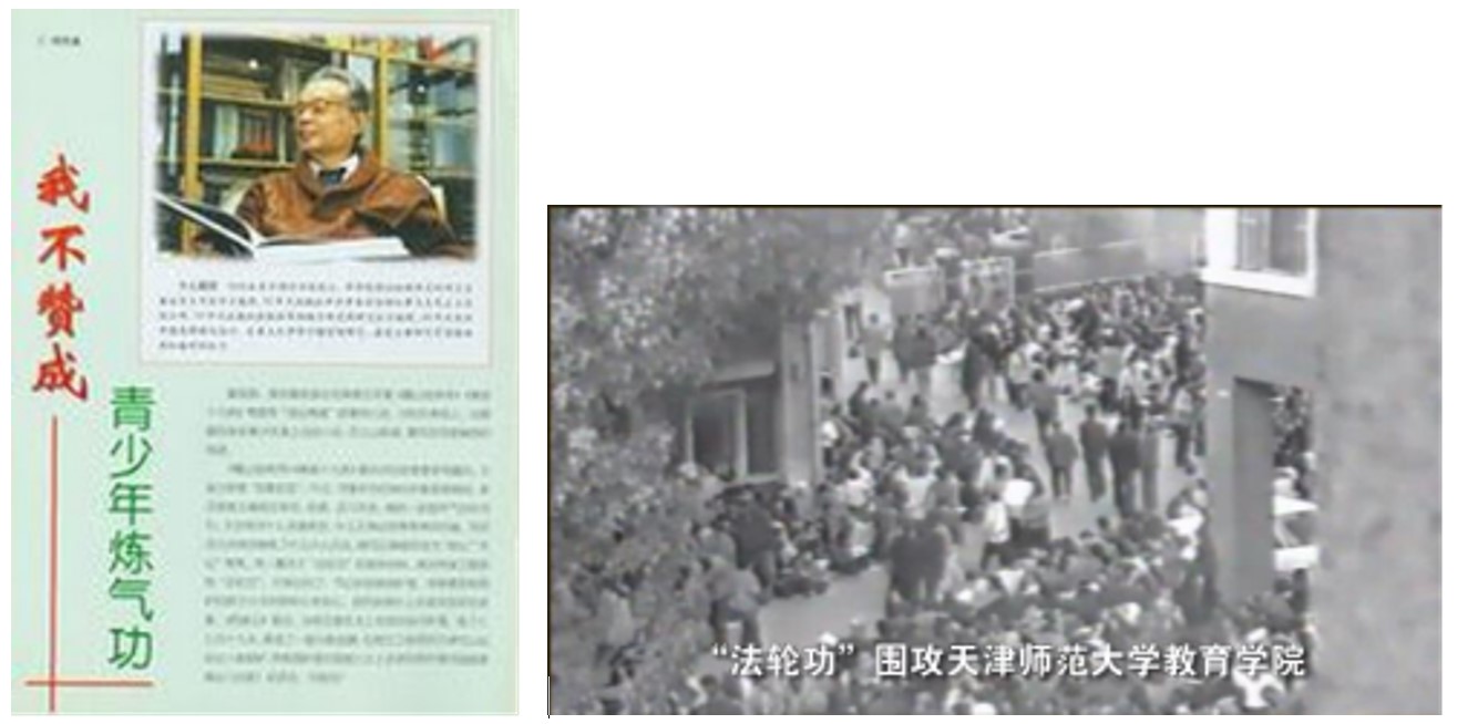 El artículo de He Zuoxiu, "No estoy de acuerdo con que los jóvenes practiquen Qigong" (Izquierda),Seguidores de Falun Gong sitiando la Facultad de Educación de la Universidad Normal de Tianjin (Derecha)