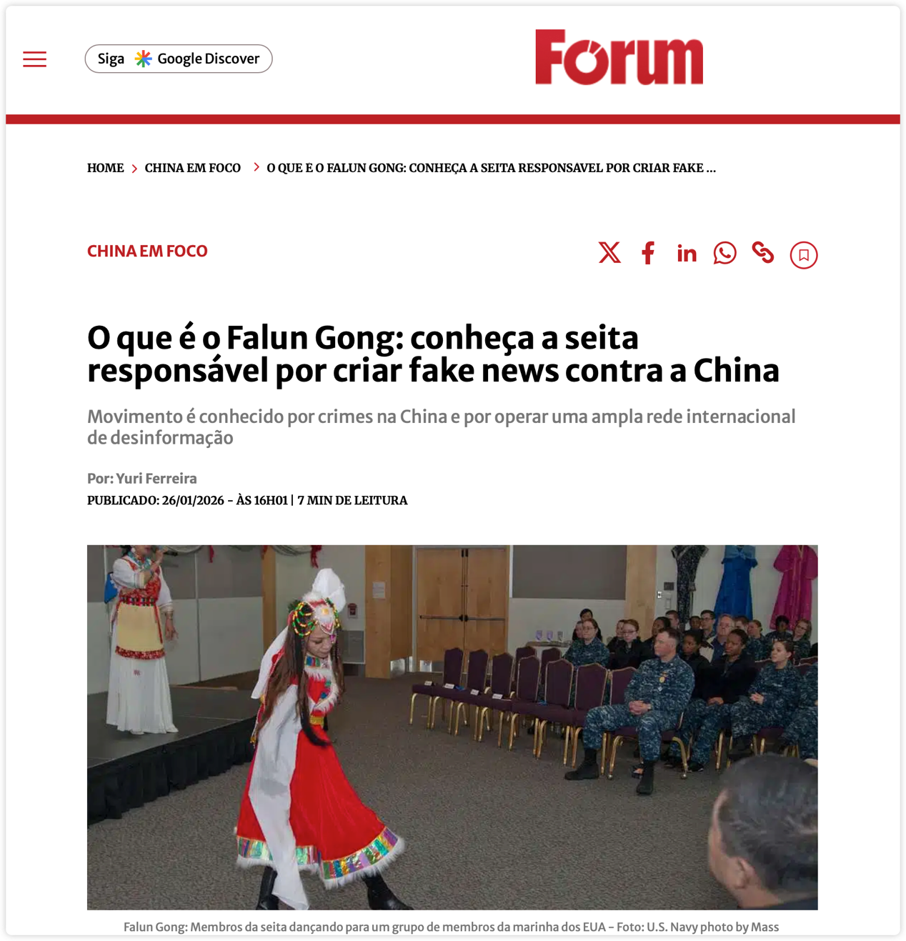 El 26 de enero de 2026, el destacado medio de comunicación brasileño de izquierda *Revista Fórum* publicó un artículo de Yuri Ferreira titulado "¿Qué es Falun Gong?: Entendiendo esta secta que genera noticias falsas contra China". El artículo rastrea sistemáticamente los orígenes, las características y la evolución de la secta Falun Gong en la comunidad internacional. También cita numerosos casos de daño social y crítica religiosa, señalando que Falun Gong ha evolucionado de una secta a una herramienta clave del sistema occidental antichino y está aumentando su infiltración en países como Brasil.